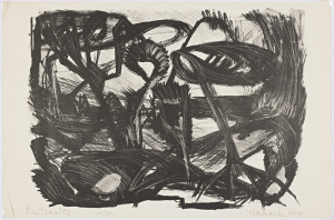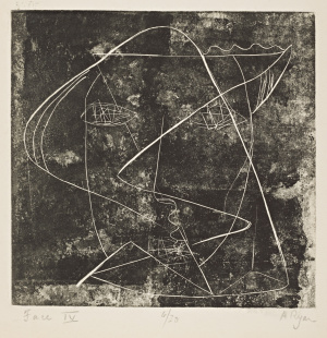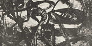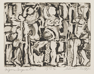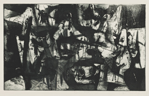 These prints showcase not only the Atelier’s technical ingenuity (such as simultaneous color printing, soft-ground etching, the use of power tools, and the layering of multiple traditional modes) but also how these innovations became tools for artists to navigate the existential and psychological currents of the time. The works reflect the disorientation of a rapidly industrialized and urbanized world, the traumas of global conflict, and the reconfiguration of how individuals moved through social and physical spaces. The plate itself emerges as more than a surface: it becomes a site where the mechanical and the organic meet, a field for recording a “dance” between process, gesture, and the unpredictable energy of the age in which the dynamic use of line and motion channels an emphasis on unrestrained movement and expressive force that resonates with the medium’s own physicality.
