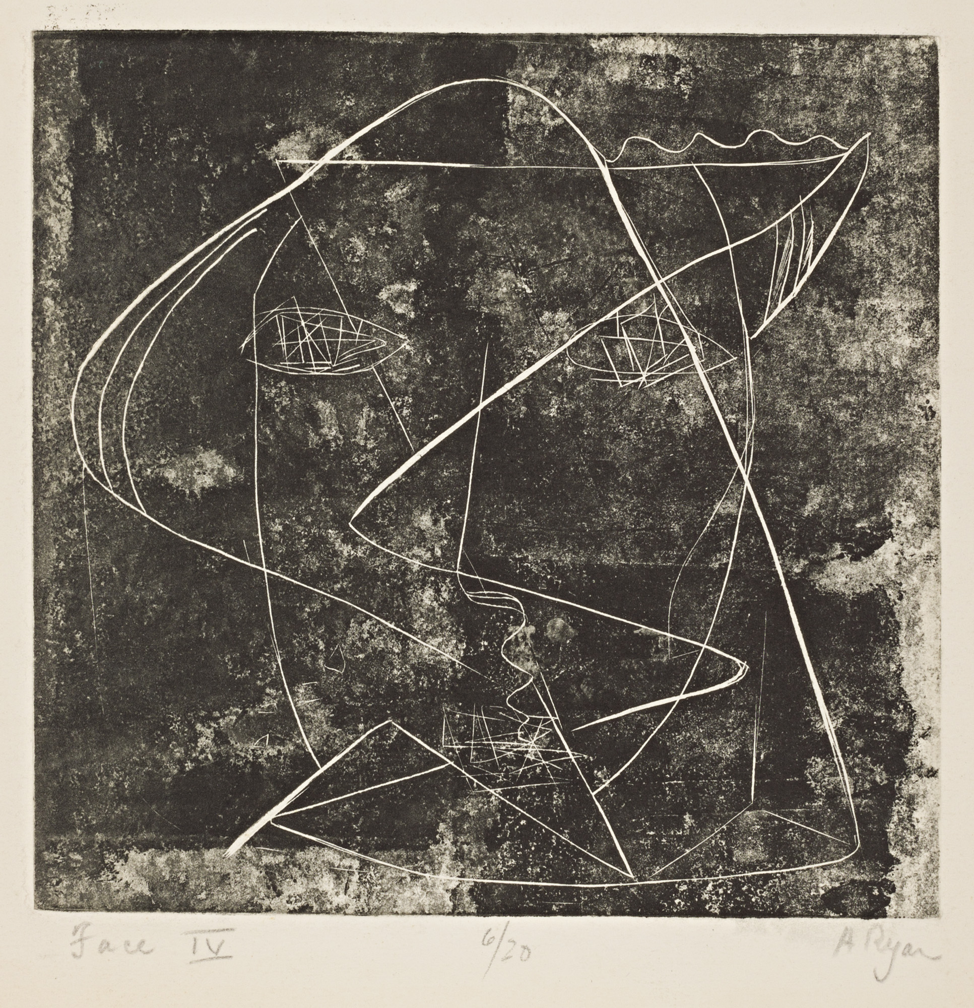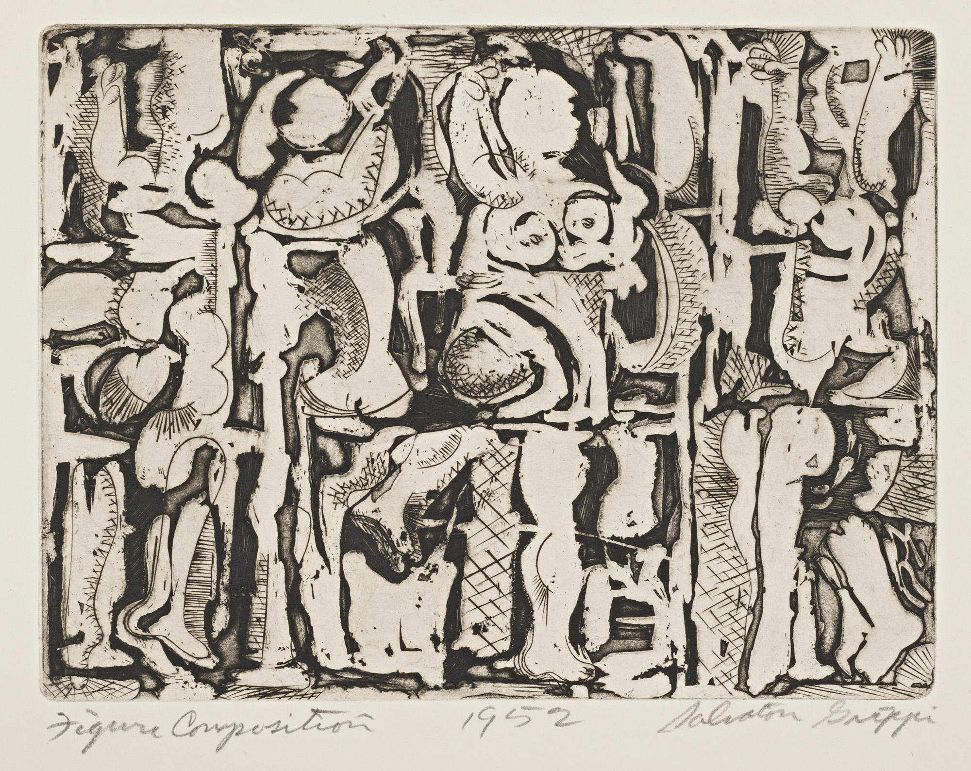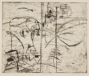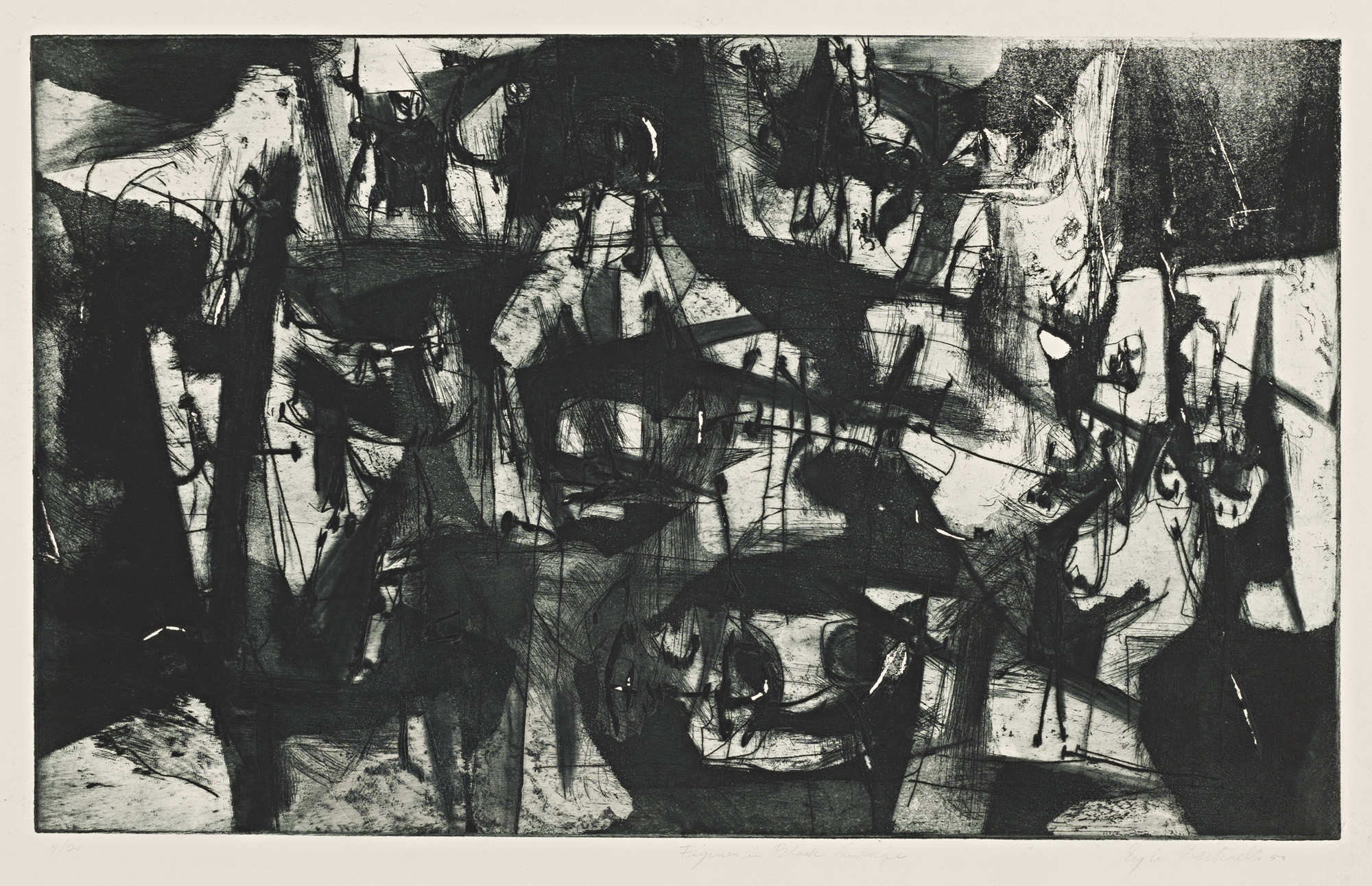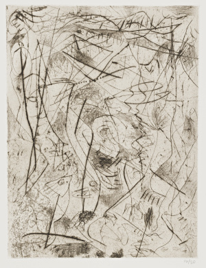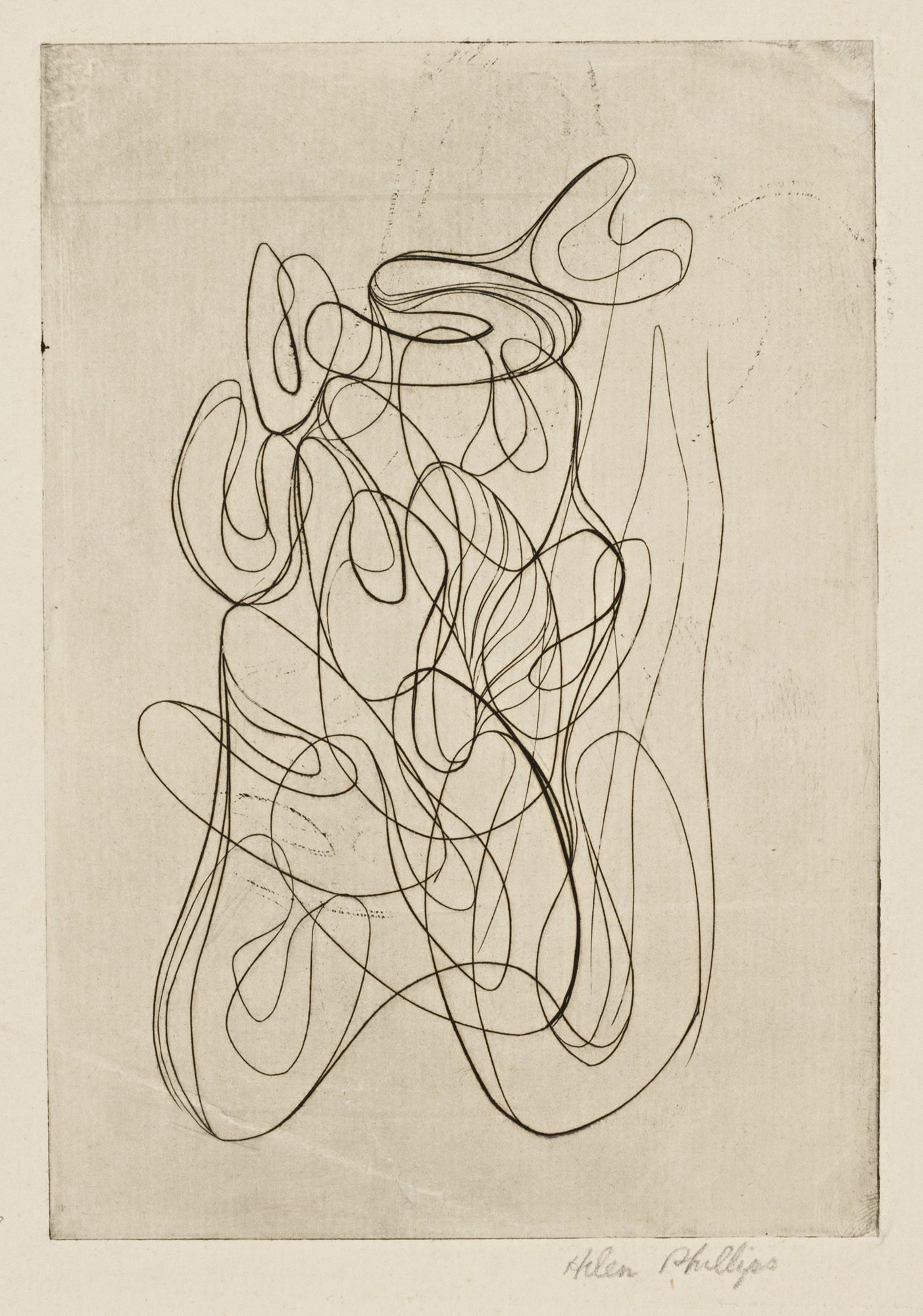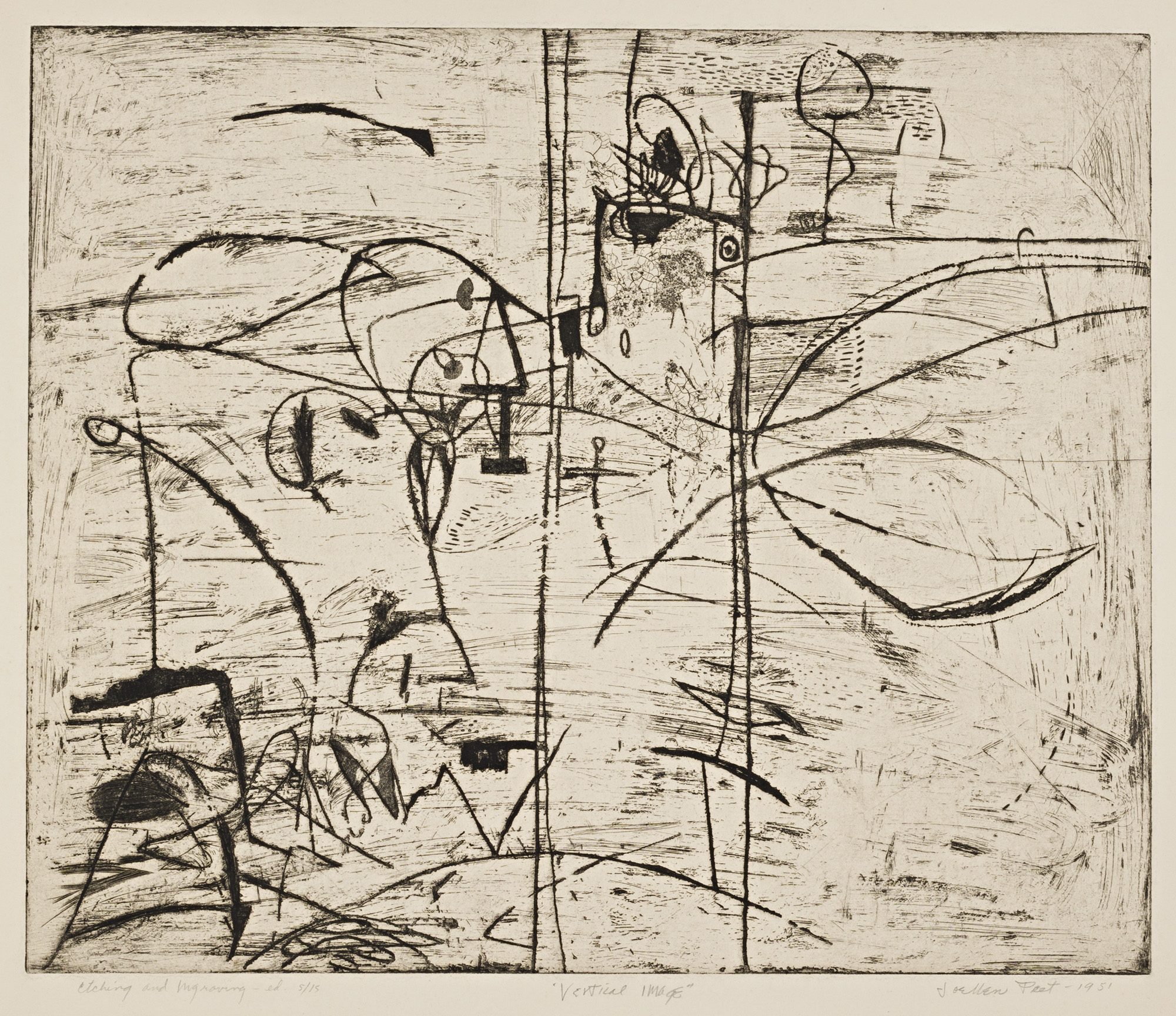 Throughout the selected prints, forms resembling human bodies appear to dissolve into the ground or reform from looping abstract gestures and frenzied lines. In some works, the figure is not depicted directly but implied physically through swift, assertive marks that trace the artist’s hand across the plate. Others employ Surrealist strategies of automatic drawing, in which the artist allows the tool to move unconsciously across the surface, absent of any preconceived image or plan. Rather than positioning these works as “lesser” counterparts to Abstract Expressionist painting, they reveal a distinct mode of process-based abstraction that centers on transformation, replication, automation, and the tension between control and surrender within the often destabilizing realities of mid-century modernity.