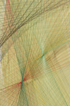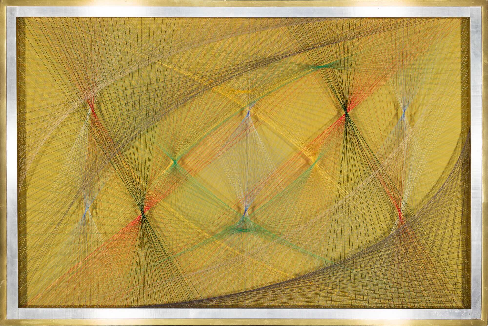 In String Composition #44 (1953), differently colored threads, including of rose, violet, and ember-orange, are pulled taut across a radiant gold plane and radiate like sound waves suspended in air. The work’s original metallic frame lends an air of containment, where the work’s interior vibrates like a dance or musical instrument. More as a system of thought and feeling than pure material study, Fuller modeled frameworks that trace the intersection of intuition and geometry. Her early wool compositions evolved into intricate constructions of monofilament, nylon, and glass, each iteration refining her sense of line as energetic fields. Based not in illusion but the factual legibility of her materials, Fuller’s thread ceased to describe surface alone, extending into the volume of her compositions. In her practice, the domestic became architectural, challenging the assumptions about how women artists should make work.